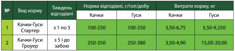 Важливо! Качки та гуси повинні мати вільний доступ до води. Перехід з одного виду корму на інший здійснюється впродовж 4-ох днів, вводячи щоденно 25/50/75% но-